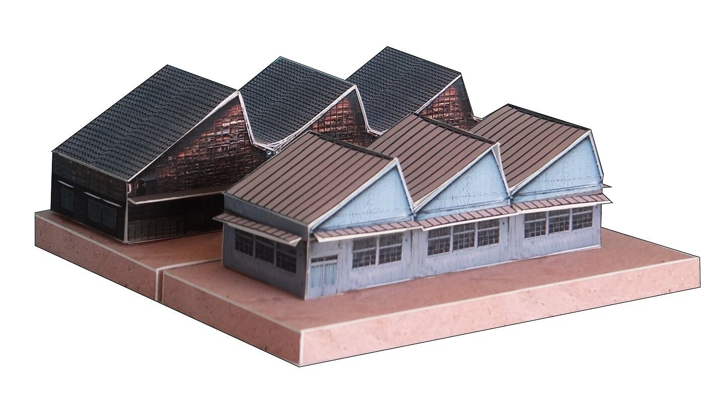 桐生市に残る独特の絹織物工場、ノコギリ屋根のペーパークラフトです。二種類の趣の異なる建物が作れます。